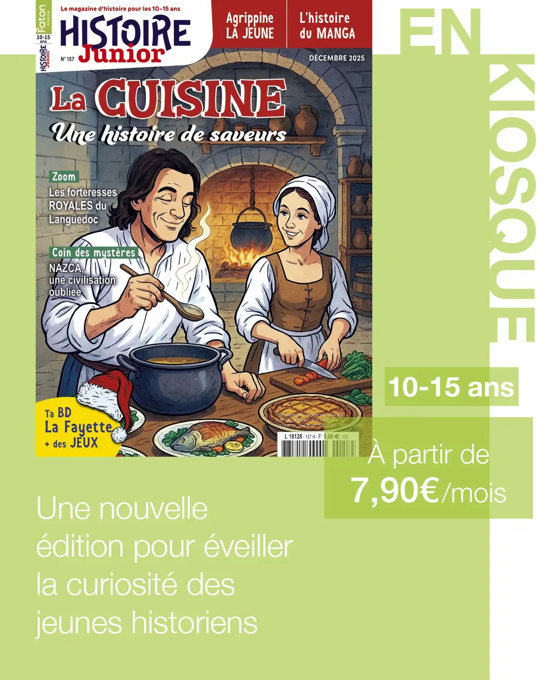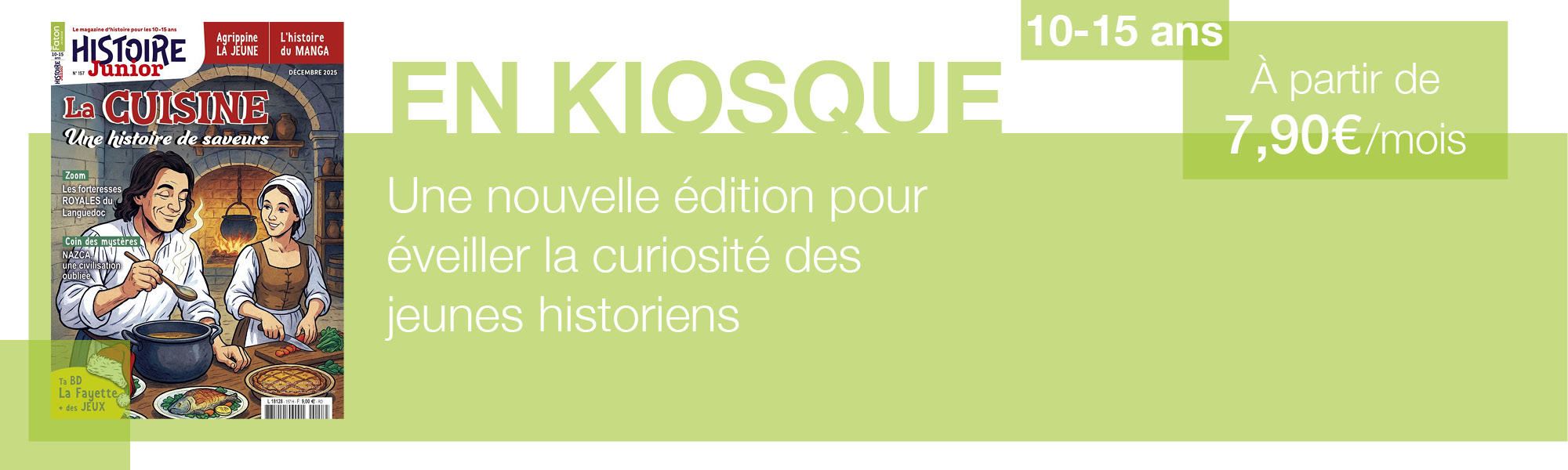 Envie d’en savoir toujours plus ? Histoire Junior vous raconte de manière passionnante une époque, la vie d’un personnage, un règne ou des évènements qui ont changé le cours de l’histoire.