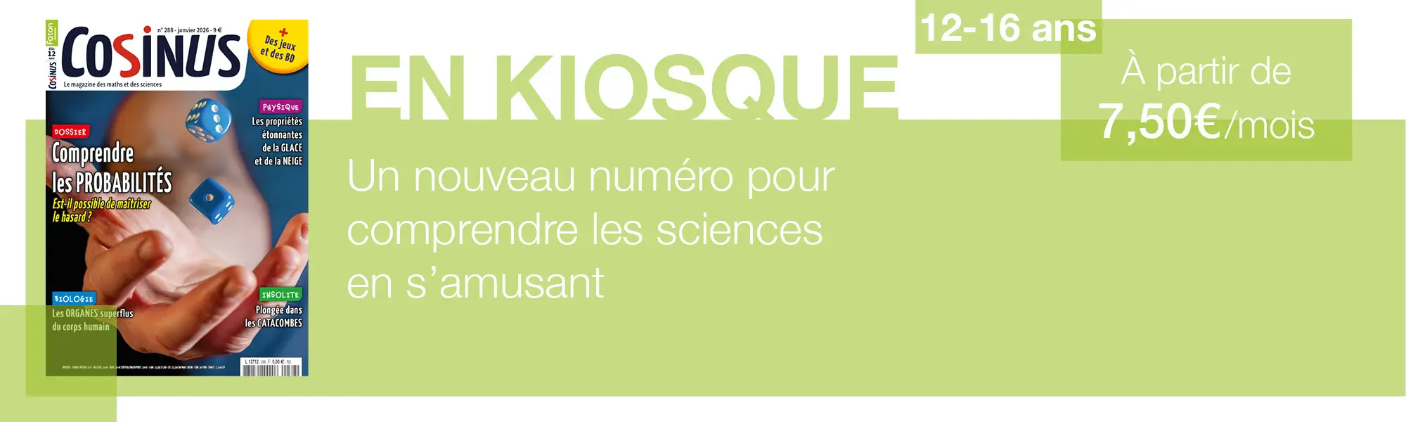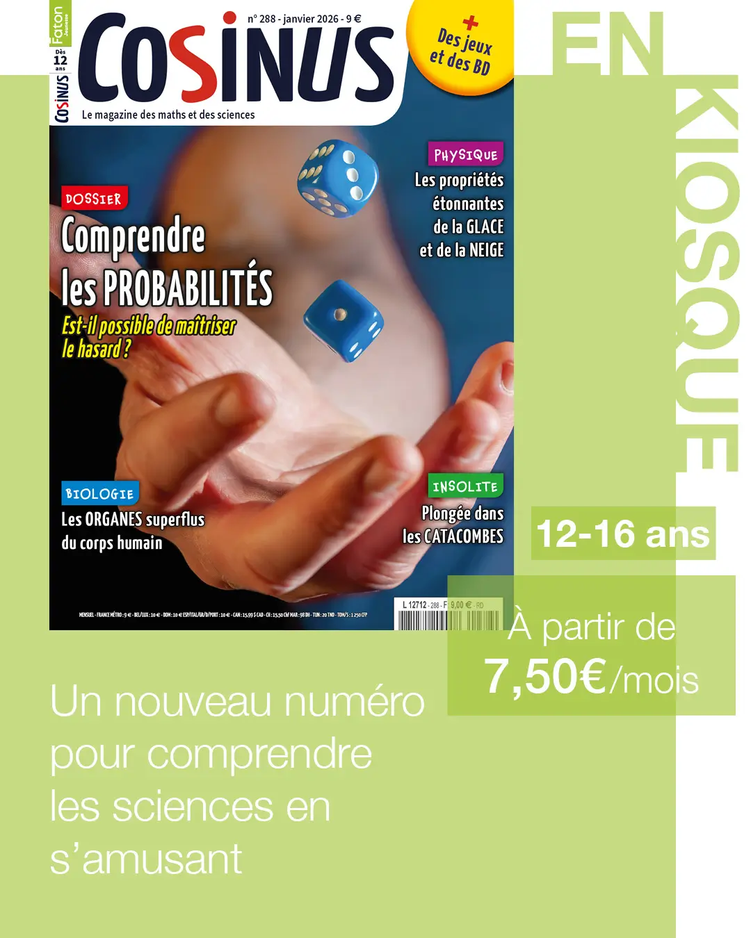 Cosinus, imaginé et élaboré chaque mois par les équipes des Éditions Faton, s’adresse aux jeunes de 12 à 16 ans, ainsi qu’aux familles et enseignants qui souhaitent rendre les mathématiques et les sciences accessibles, ludiques et passionnantes.