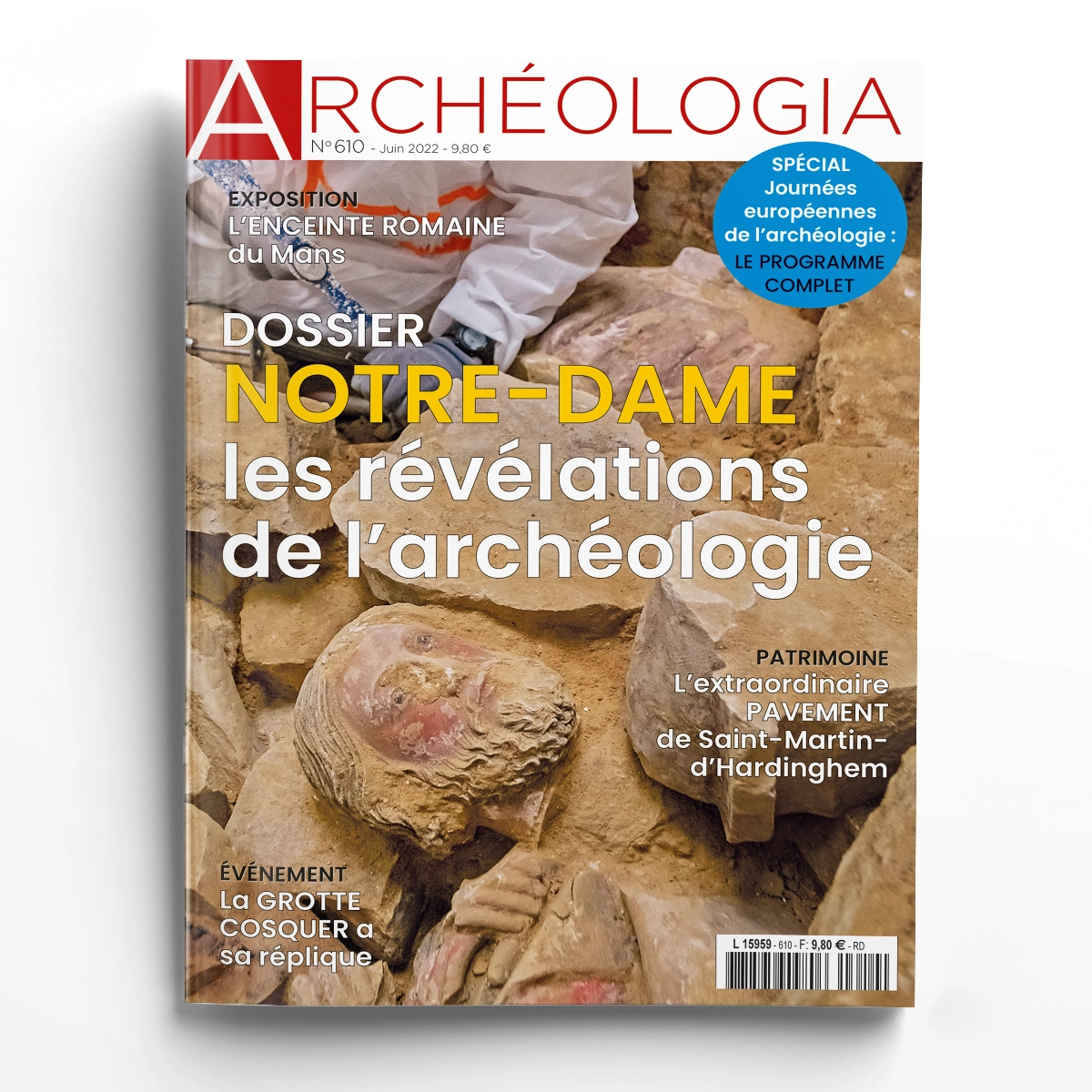 Pour ce numéro de juin, Archéologia vous propose un passionnant dossier sur l’archéologie au service de la cathédrale Notre-Dame. Dans la vaste réflexion scientifique qui s’est mise en place après l’incendie d’avril 2019, l’archéologie a joué un rôle clef. Nous vous présentons un premier bilan d’un chantier hors-norme et les techniques de pointe mises en œuvre pour le mener à bien. Découverte par Henri Cosquer, à 37 m sous l’eau, la grotte qui porte le nom de son inventeur est un trésor de l’art pariétal paléolithique. Fréquentée vers 33 000 puis vers 19 000 avant notre ère, elle abrite un bestiaire peint inédit : aujourd’hui inaccessible, elle fait l’objet d’une spectaculaire restitution abritée dans la Villa Méditerranée à Marseille. Dans le Pas-de-Calais, à Saint-Martin-d’Hardinghem, le site de la Cour Lévêque sur les bords de l’Aa témoigne du goût des évêques au Moyen Âge pour les résidences campagnardes. Menacé par la construction d’un bassin d’expansion des crues, il a fait l’objet d’une opération de fouille préventive en 2016, menée par l’Inrap et la Direction de l’archéologie du Pas-de-Calais. Monument emblématique du Mans, l’enceinte de la ville fait l’objet d’une magistrale exposition réunissant près de 200 œuvres. Construite au cours de l’Antiquité tardive, elle est depuis plus de 40 ans beaucoup mieux connue et comprise grâce, en particulier, aux recherches archéologiques dont elle ne cesse de faire l’objet. Sans oublier notre cahier spécial de 16 pages vous détaillant tout le programme des Journées Européennes de l’Archéologie, nos pages d’actualités des musées, des fouilles et de la recherche, notre objet du mois, notre archéofolio et notre sélection de livres ! En vous souhaitant de belles lectures.