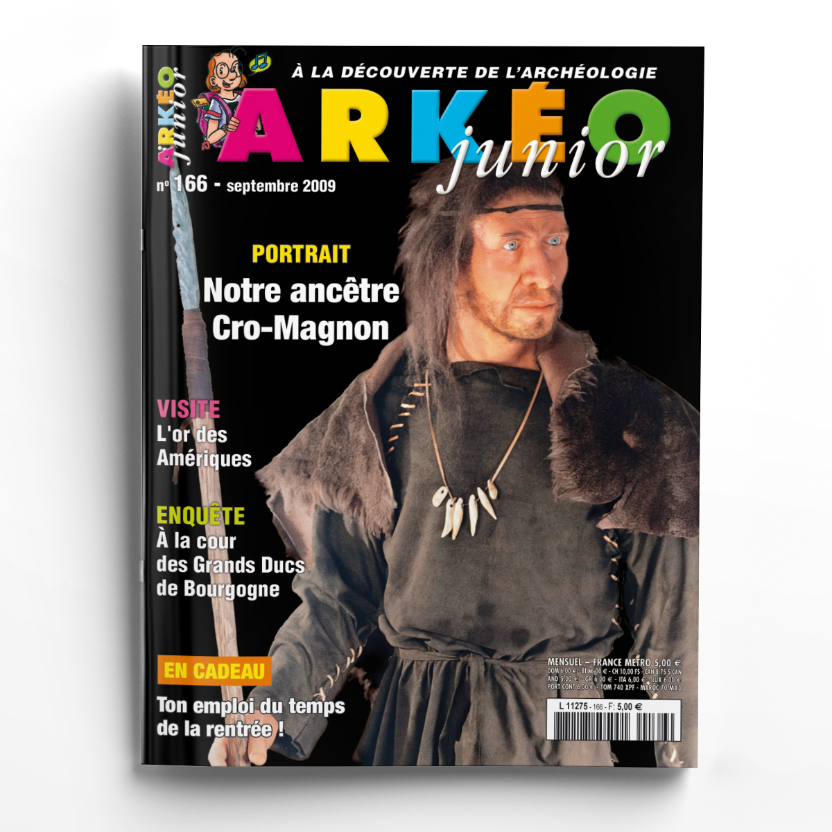 Arkéojunior, revue d'archéologie pour les enfants. Dans ce numéro : Cro-Magnon, l'or des Amérique et une enquête sur la cour des Ducs de Bourgogne.