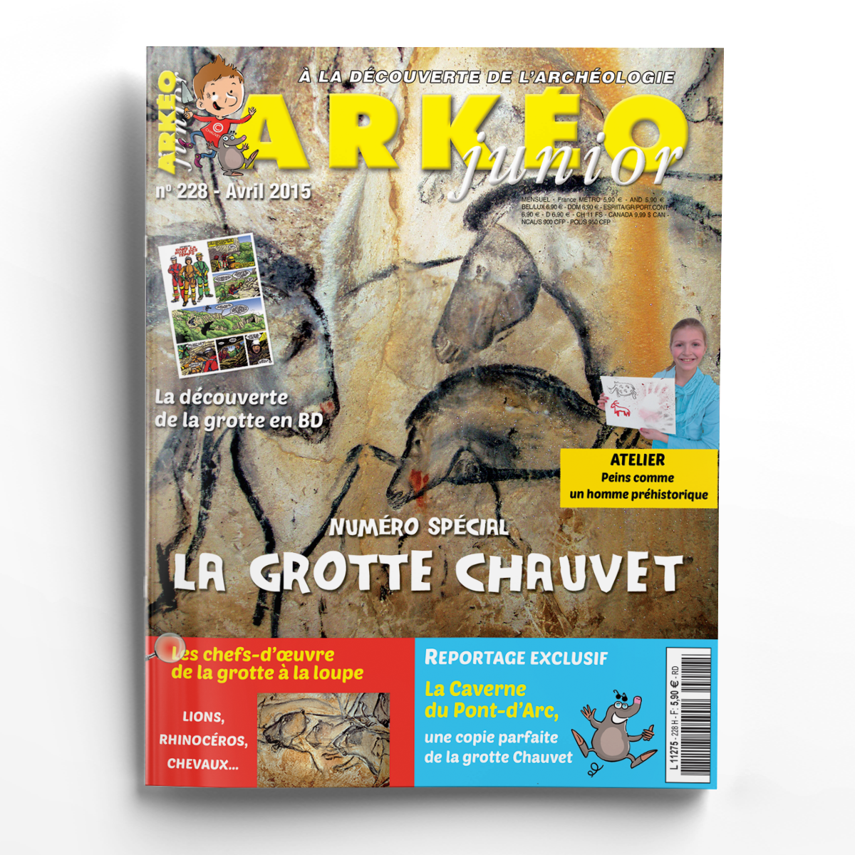 Ce mois-ci, Arkéo Junior te propose un numéro spécial entièrement consacré à la grotte Chauvet. Une grotte encore plus vieille que la grotte de Lascaux, que trois spéléologues ont découverte en 1994 dans une falaise de l'Ardèche (France). Dans cette cavité aux dimensions impressionnantes, et au décor naturel exceptionnel, nos lointains ancêtres ont peint et gravé, il y a près de 36 000 ans, de magnifiques représentations animales. Fermée au public par souci de conservation, cette grotte est aujourd'hui accessible grâce à l'incroyable copie (fac-similé) que la Caverne du Pont-d'Arc vient tout juste de réaliser à l'identique... L'ouverture de ce formidable espace de visite est prévue le 25 avril 2015. Arkéo te le fait donc découvrir en avant-première et te dit tout sur ses secrets de fabrication ! Et pour compléter ce dossier spécial, l'enquête du mois s'intéresse à la vie des hommes préhistoriques à l'époque... de la grotte Chauvet évidemment. De quoi être incollable sur le sujet ! Retrouve également dans ce numéro la découverte de cette grotte en BD, avec quatre pages inédites qui te feront revivre ce moment de grande émotion. Quant à l'atelier, il te permettra de t'essayer à la peinture "préhistorique" en testant cinq méthodes différentes pratiquées par Cro-Magnon lui-même. Très bonne lecture !
