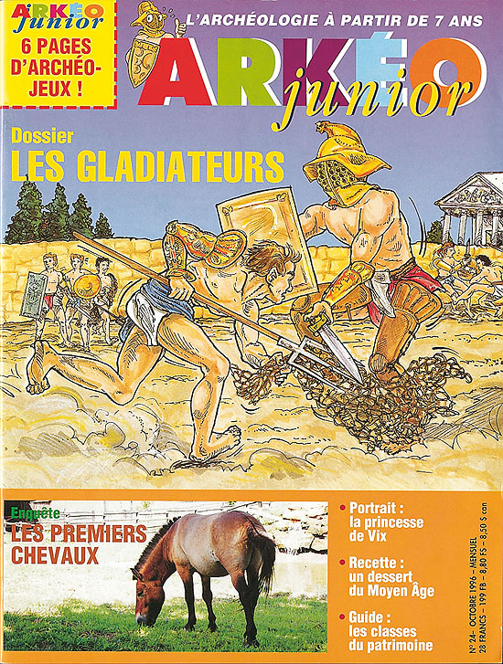Dossier : les gladiateurs Enquete : les premiers chevaux Portrait : la princesse de Vix Recette : un dessert du Moyen Age Guide : les classes du patrimoine 6 pages d'archéo-jeux