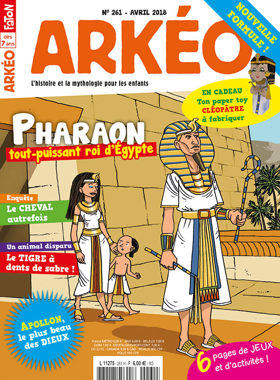 Attention ! Pharaon fait son entrée... Tout le monde baisse les yeux par respect. Enfin, surtout les lecteurs d'Arkéo : c'est plus facile pour lire le nouveau numéro d'avril ! Et ça tombe bien, puisque c'est justement de Pharaon dont il est question ce mois-ci ! Au sommaire aussi de ton magazine préféré, une enquête sur la place du cheval dans l'Histoire, et tes rubriques habituelles pour être incollable sur les sujets les plus passionnants : un animal disparu, le dieu du mois, une date à retenir, l'album-photo et l'image-mystère. Sans oublier le coin de la récré, ses jeux et ses activités, et bien sûr tes BD. Bonne lecture !