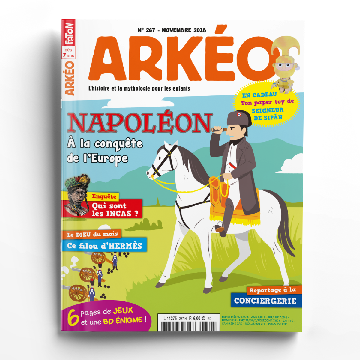 Ce mois-ci, dans Arkéo, le mot d’ordre pour tous est « vive l’empereur ! ». Napoléon Ier est un monarque incontournable de l’histoire de France et le grand dossier te présente quelques faits marquants de sa vie au rythme des nombreuses batailles qu’il a menées un peu partout en Europe. Retrouve aussi tes rubriques habituelles, l’image-mystère, un reportage, le dieu du mois et une enquête sur les Incas, dont la civilisation brillante a prospéré en Amérique du Sud jusqu’au 16e siècle et l’arrivée des premiers conquistadors espagnols ! Sans oublier tes jeux du coin de la récré et tes BDs préférées. Bonne lecture !