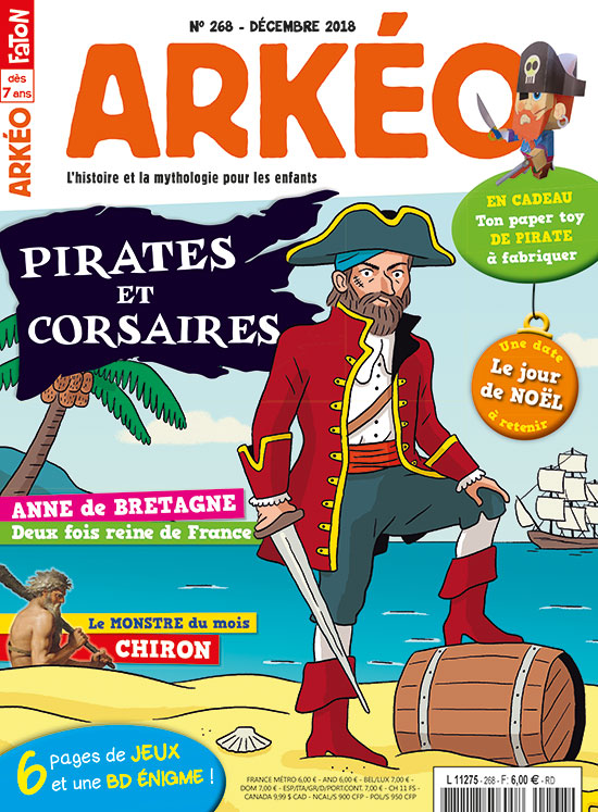 À l’abordage ! Ce mois-ci, dans Arkéo, tu l’auras compris... il n’y aura pas de quartier ! Corsaire ou pirate, il te faudra choisir. Mais pour t’y aider, le grand dossier te dit tout ce qu’il y a à savoir sur ces deux terreurs des mers. Après quoi, tu pourras mettre pied à terre et partir à la rencontre d’Anne de Bretagne, qui a été deux fois reine de France durant sa vie ! Retrouve aussi tes rubriques habituelles, l’image-mystère, une date à retenir et le monstre du mois, qui n’est autre que Chiron, le centaure « gentil » qui s’est chargé de l’éducation d’Achille. Sans oublier tes jeux du coin de la récré et tes BDs préférées. Bonne lecture et bonnes fêtes de fin d'année !