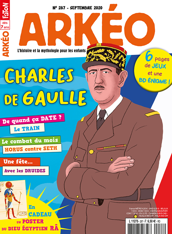 Ce mois-ci, Arkéo te propose de découvrir la vie incroyable du général de Gaulle. Officier de carrière dans l’armée française, il devient chef de la France libre durant la Seconde Guerre mondiale avant d’être le premier président de la Ve République en 1959 ! Retrouve aussi tes rubriques habituelles, l’image-mystère et l’album photo, ainsi que le combat du mois consacré cette fois-ci à la lutte mythique entre Horus et Seth pour le trône d’Égypte. Bonne lecture et excellente rentrée !