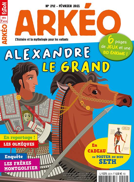 Si tu rêves de conquérir un empire, Arkéo te propose ce mois-ci de suivre l’exemple d’Alexandre le Grand... Il faut dire que question empire, le monsieur en connaît un rayon ! Au 4e siècle avant J.-C., il règne même sur le plus vaste de l’Antiquité. Respect ! Puis, que dirais-tu d’un petit tour en ballon à air chaud ? C’est avec les frères Montgolfier évidemment... Retrouve aussi tes rubriques habituelles, l’image-mystère, la déesse du mois et un reportage sur les Olmèques. Sans oublier tes jeux du coin de la récré et tes BD préférées. Bonne lecture !