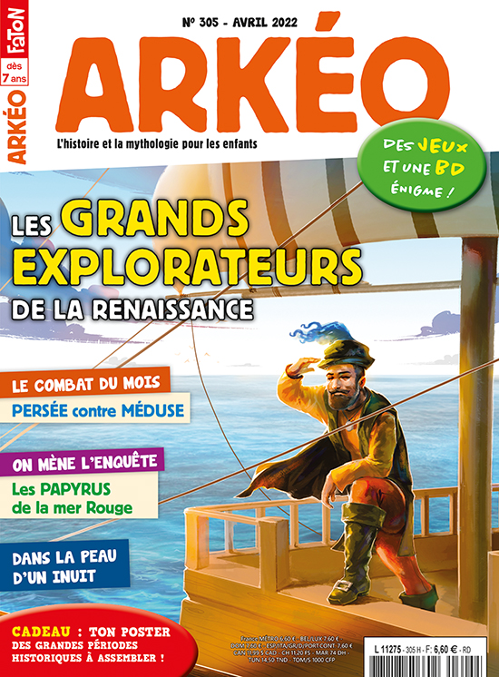 Ce mois-ci, Arkéo repousse les limites du monde connu avec les grands explorateurs de la Renaissance. Entre la découverte de l’Amérique et les premiers tours du monde, ceux-ci ont fort à faire... Et c’est parti pour un dossier qui prend le large ! Puis, direction l’Égypte antique, au temps du roi Khéops, pour découvrir le quotidien des ouvriers chargés de construire sa grande pyramide. Retrouve aussi tes rubriques habituelles pour tout savoir sur les origines du jean et le combat qui a opposé Persée à Méduse, la monstrueuse Gorgone. Sans oublier tes jeux du coin de la récré et tes BD préférées. Bonne lecture !