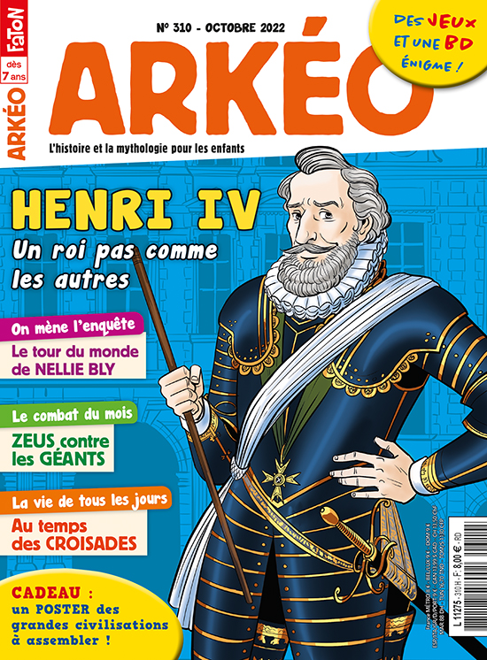 Ce mois-ci, Arkéo part à la rencontre du bon roi Henri IV, dont le règne (1589-1610) est une véritable promesse de paix pour le royaume de France qui sort de huit guerres de Religion terribles... Ton grand dossier t’en dit plus sur sa vie trépidante, ses origines, ses amours et sa fin tragique. Puis, prépare ton sac pour faire le tour du monde aux côtés de Nellie Bly, une intrépide journaliste américaine de la fin du 19e siècle. Sans oublier tes jeux du coin de la récré et tes BD préférées. Bonne lecture !