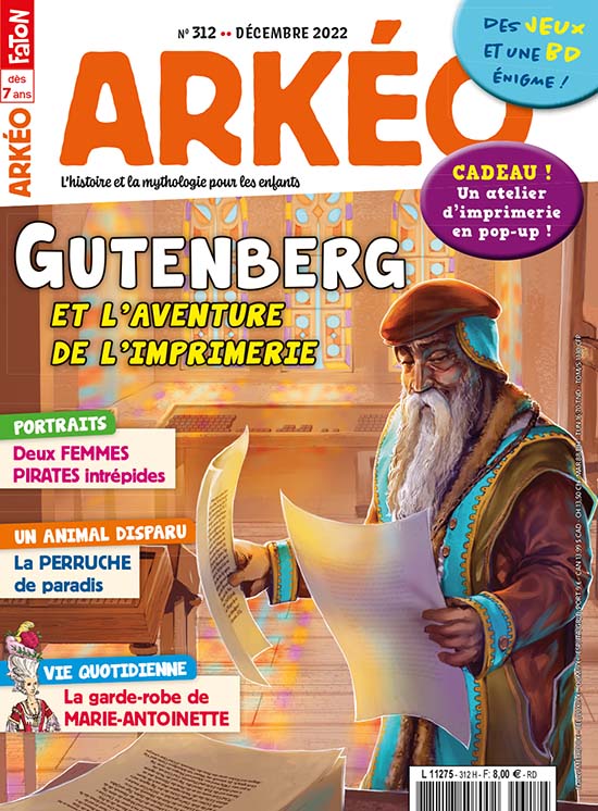 Ce mois-ci, Arkéo t’emmène dans la ville de Mayence au 15e siècle à la découverte de Gutenberg, le génial inventeur grâce auquel l’imprimerie a connu un formidable développement. Le grand dossier t’en dit plus sur sa vie et les secrets de ses inventions qui ont révolutionné le monde ! Puis, direction la mer des Caraïbes pour faire la connaissance de deux femmes pirates du 18e siècle qui n’ont décidément pas froid aux yeux... Sans oublier tes rubriques habituelles, les jeux du coin de la récré et tes BD préférées. Bonne lecture !