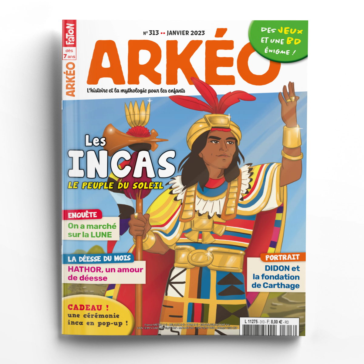 Ce mois-ci, Arkéo part à la rencontre des Incas, au cœur de la cordillère des Andes. Leur brillante civilisation s’y est épanouie entre le 13e et le 16e siècle, avant que la conquête espagnole n’y mette fin par la force. Le grand dossier te propose un large tour d’horizon de leur vie quotidienne mais aussi de leurs croyances, de l’art et de l’organisation de leur société. Puis, direction la Lune en compagnie des astronautes américains de la mission Apollo 11, après un bref détour par Carthage pour découvrir l’histoire légendaire de sa fondation. Sans oublier tes rubriques habituelles, les jeux du coin de la récré et tes BD préférées. Bonne lecture !