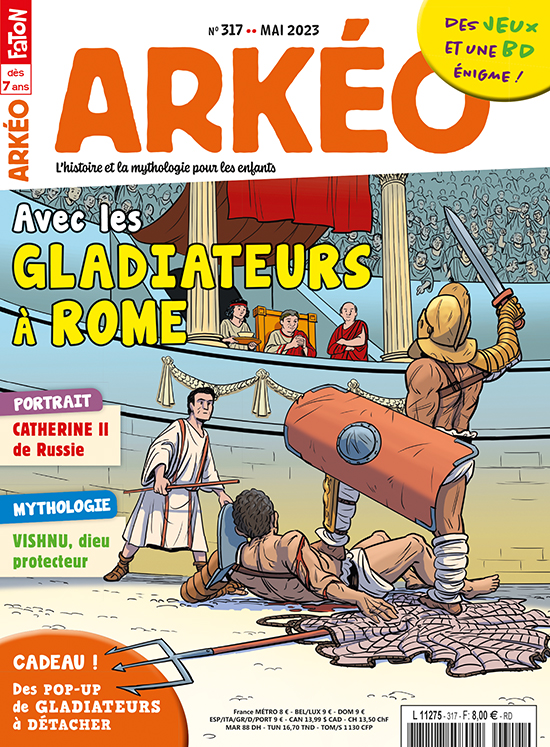 Ce mois-ci, Arkéo visite les arènes des amphithéâtres romains pour approcher au plus près des gladiateurs. C'est là, en effet, que ces combattants se donnent en spectacle pour la plus grande joie d'un public passionné. Mais d'où viennent-ils et qui sont-ils vraiment ? Ton grand dossier te dit tout ! Puis, direction la Grande Russie du 18e siècle pour faire connaissance avec Catherine II, une souveraine qui a marqué l'Histoire. Sans oublier tes rubriques habituelles, le dieu du mois et la vie de tous les jours consacrée cette fois à un chantier de cathédrale au Moyen Âge, mais aussi les jeux du coin de la récrée et tes BD préférées. Bonne lecture !