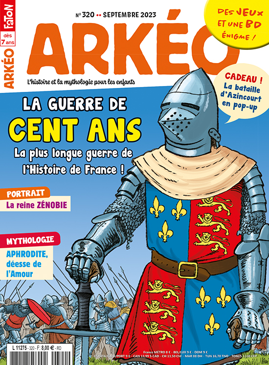 Ce mois-ci, Arkéo te raconte les origines et les nombreux rebondissements de la guerre de Cent Ans. Commencée officiellement en 1337 et terminée en 1453, elle a donc duré bien longtemps en étant toutefois entrecoupée de plusieurs périodes de paix. Pour ne pas t’y perdre et bien comprendre les enjeux de ce long conflit meurtrier, le grand dossier te sera d’une aide précieuse ! Découvre ensuite la belle Zénobie, qui a régné dans la cité antique de Palmyre. Au 3e siècle, elle a même défié un puissant empereur de Rome... Sans oublier tes rubriques habituelles, les jeux du coin de la récré et tes BD préférées. Bonne lecture et bonne rentrée !