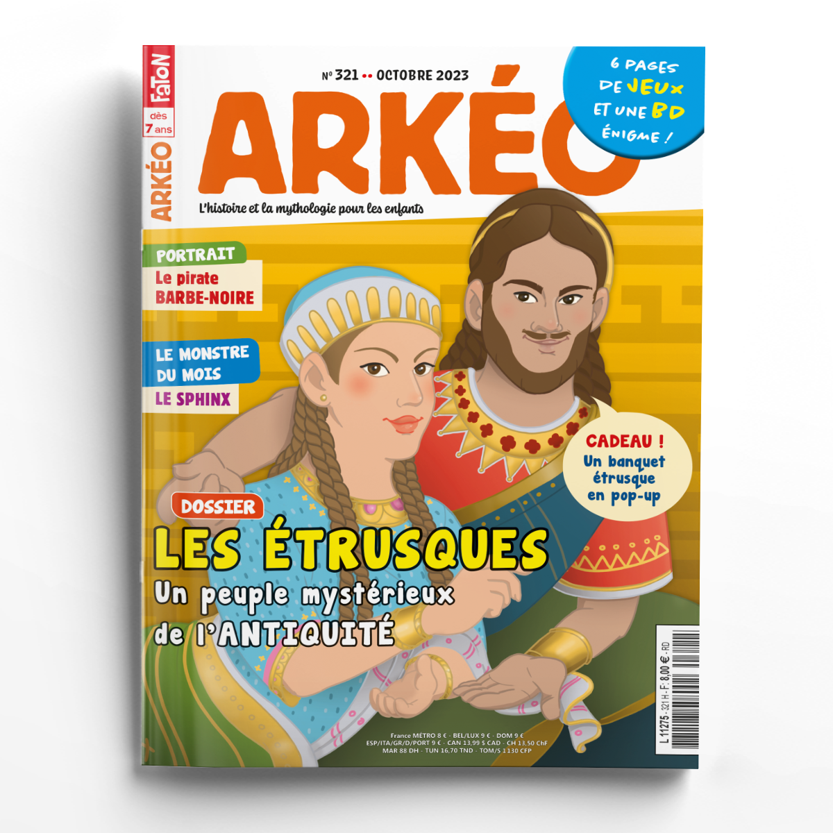 Ce mois-ci, Arkéo t’emmène en Italie à la découverte d’un peuple antique vraiment fascinant : les Étrusques. Éclipsée par la conquête romaine dès le 3e siècle avant J.-C., leur riche civilisation est restée dans l’oubli pendant très longtemps... Heureusement, depuis plusieurs siècles, des fouilles archéologiques permettent d’en savoir plus sur leur histoire et leur société. Arkéo te dit tout ! Puis, ton magazine préféré met les voiles vers la mer des Caraïbes à la rencontre de Barbe-Noire, le plus célèbre des pirates. Sans oublier tes rubriques habituelles, les jeux du coin de la récré et tes BD préférées.Bonne lecture !