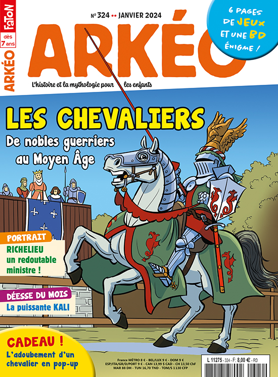 Ce mois-ci, Arkéo part à la rencontre des chevaliers. Gentes dames et messires lecteurs, direction le Moyen Âge, pour en apprendre plus sur ces véritables guerriers d'élite : origines, formation, équipement, et bien d'autres choses encore sont détaillées dans le grand dossier. Puis, ta revue préférée te dresse le portrait du cardinal de Richelieu, le principal ministre du roi Louis XIII. Au début du 17e siècle, cet homme de pouvoir, reconnaissable à son habit rouge, gouverne d'une main de fer le royaume de France... Sans oublier tes rubriques habituelles, les jeux du coin de la récré et tes BD préférées. Bonne lecture et bonne année !