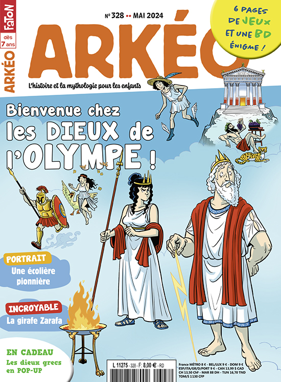 Ce mois-ci, Arkéo t’emmène tout en haut du mont Olympe, à la découverte des dieux et déesses qui y vivent. Les Grecs de l’Antiquité les appellent les Olympiens ! Puis, direction les États-Unis, au tout début des années 1960. C’est là qu’une petite écolière très courageuse, Ruby Bridges, a fait une rentrée des classes vraiment particulière ! Arkéo t’en dit plus. Et connais-tu Zarafa ? Derrière ce nom rigolo se cache une girafe offerte en cadeau au roi de France Charles X. Elle est aussi la première girafe à avoir vécu en France, de 1827 à 1845. Sans oublier tes rubriques habituelles, les jeux du coin de la récré et tes BD préférées. Bonne lecture !