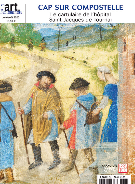 Un numéro estival sous le signe du voyage ! Art de l'enluminure met le cap sur Compostelle… au départ de Tournai. Notre guide sera le frontispice du cartulaire de l'hôpital tournaisien Saint-Jacques, un chef-d'œuvre du Maître du Livre d'heures de Dresde. Mêlant invention iconographique et détails documentaires, ces miniatures de la fin du XVe siècle nous font accéder aux différents aspects du pèlerinage médiéval et de la dévotion à saint Jacques.