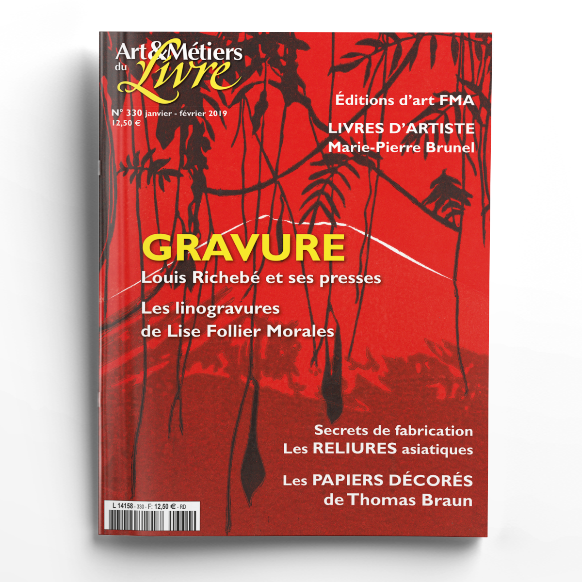 Art & Métiers du Livre vous adresse tous ses vœux pour cette nouvelle année ! Dans ce premier numéro 2019, nous vous proposons quatre portraits de professionnels : Thomas Braun et ses papiers dominotés, Louis Richebé et ses presses, Françoise Maréchal-Alligand à la tête des Éditions d’art FMA et Marie-Pierre Brunel, artiste du livre. Sans oublier les secrets de fabrication des reliures asiatiques de Roger Green et ceux de la reliure à dos rapporté de Benjamin Elbel. Parmi une large sélection d’actualités (expositions et salons), focus sur les linogravures en couleurs de Lise Follier Morales.