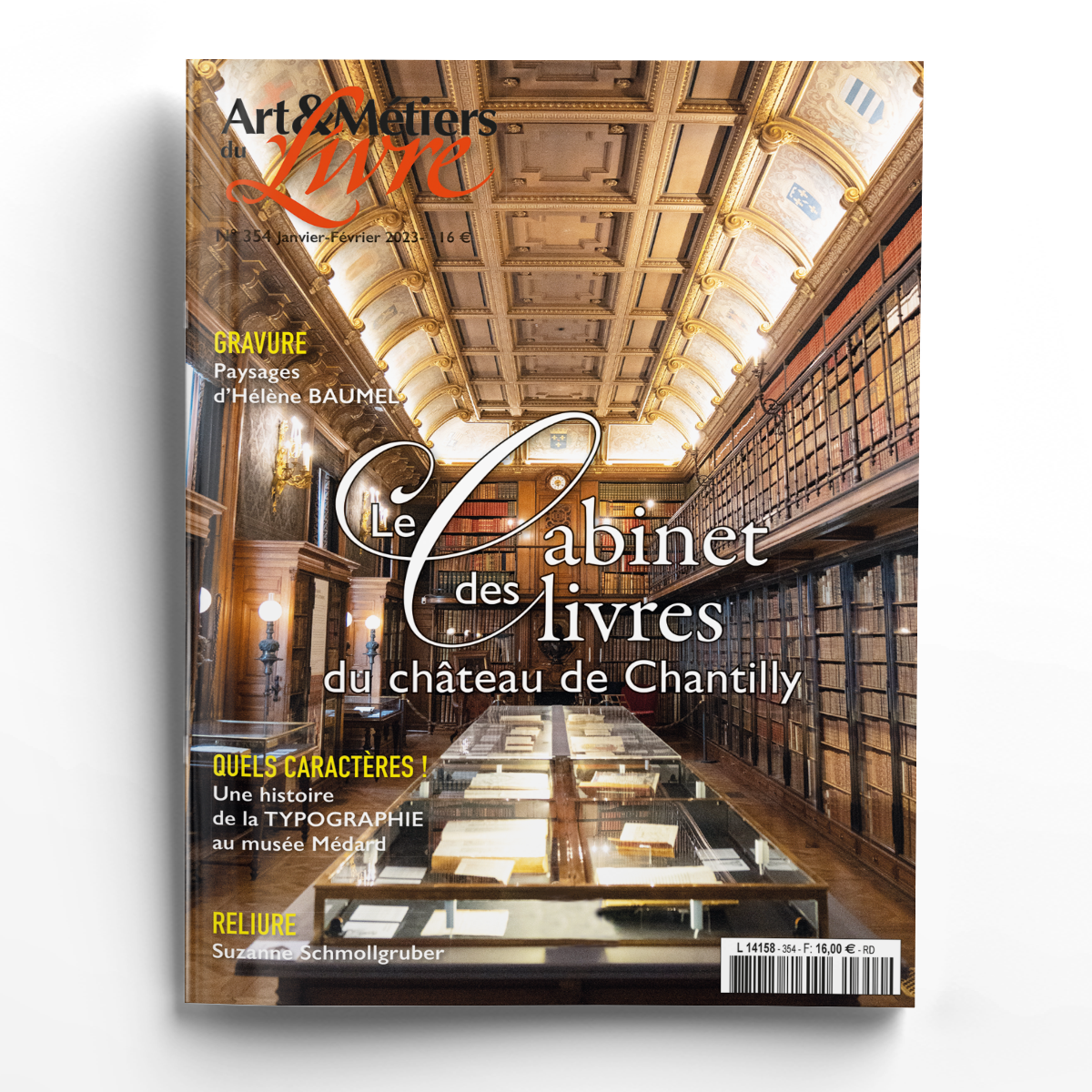 Art & Métiers du Livre et les Éditions Faton vous souhaitent une très bonne année ! Outre l'actualité du livre et de l'estampe, vous découvrirez dans ce premier numéro 2023, le Cabinet des livres du château de Chantilly, une exposition sur les caractères d’imprimerie au musée Médard (Hérault) et les paysages mouvants gravés par Hélène Baumel. Nous proposons aux amateurs de reliure un entretien avec Suzanne Schmollgruber, la présentation des projets des étudiants en BMA du lycée Corvisart et les astuces de Florent Rousseau. Dans le Carnet du bibliophile figurent vos rubriques consacrées aux livres d’artiste, aux ventes aux enchères, à la promenade du bibliophile…