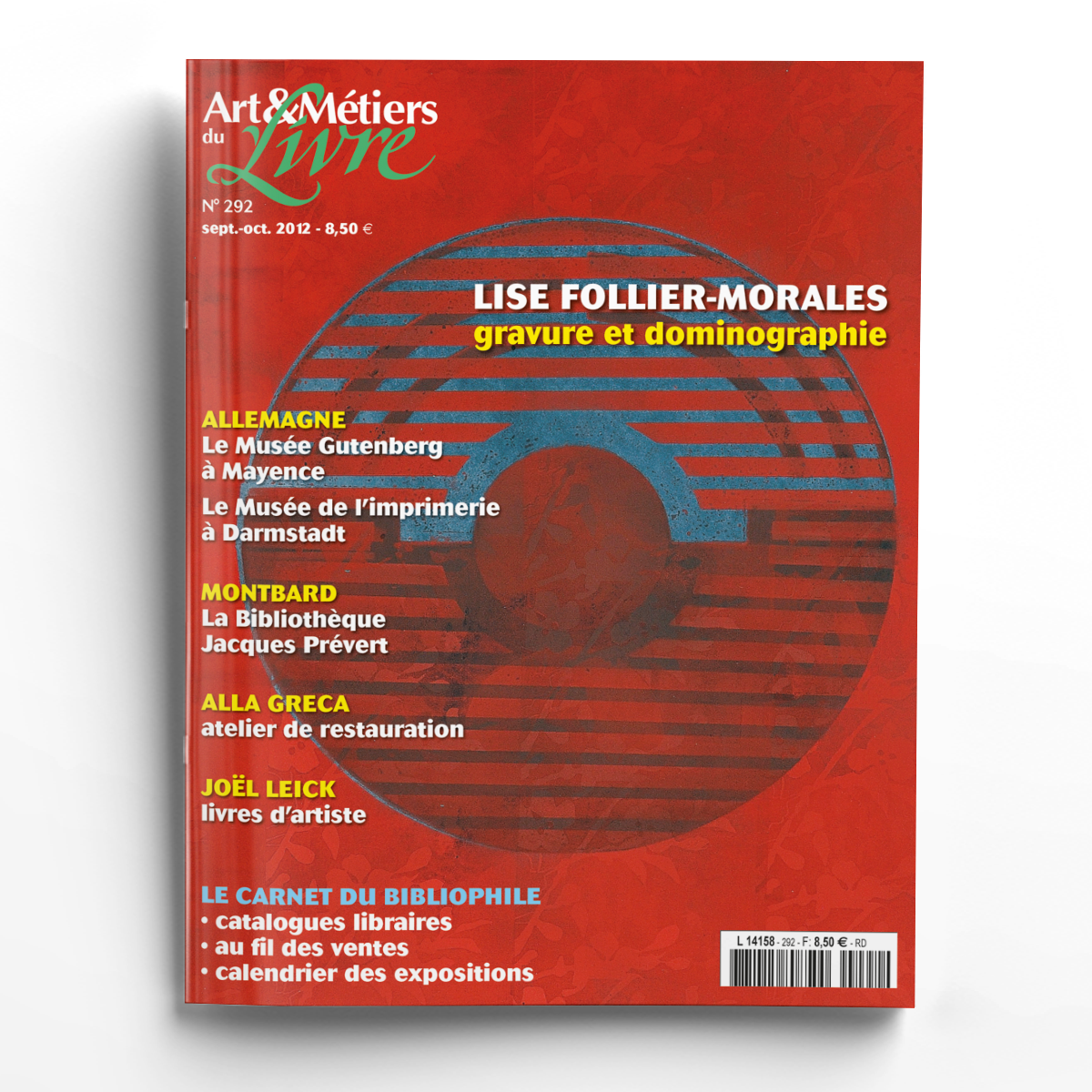 La rentrée 2012 est riche d'événements et de découvertes. Lise Follier-Morales nous invite à un beau voyage au travers de ses multiples talents, notamment la dominographie, une technique qu'elle a mise au point. La Bibliothèque Jacques-Prévert de Montbard, en Bourgogne, joue un rôle important au cœur d'un territoire rural grâce à une dynamique basée sur la lecture publique et l'animation sans négliger la valorisation de son fonds ancien. L'Allemagne et la typographie, voici une longue et vieille histoire que nous vous proposons de redécouvrir en passant par le Musée Gutenberg à Mayence et par une visite à Darmstadt, chez Rainer Gerstensberg, l'homme qui ressuscite les caractères en plomb. Restaurer les livres et les documents anciens pour les transmettre aux génération future, c'est la passion d'Isabelle Blivet qui œuvre au sein de son atelier Alla Greca. Joël Leick marie avec bonheur la gravure, le dessin, la peinture ou la photographie pour nous livrer des livres d'artistes, des créations en solitaire ou à quatre mains.