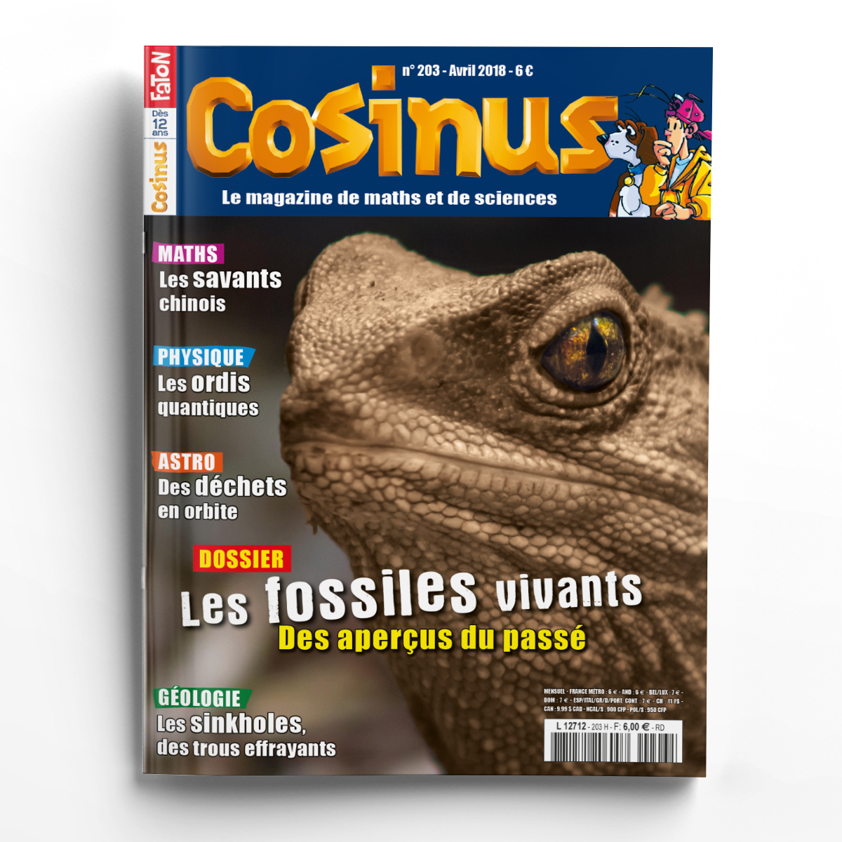 Ils semblent sortis d'un passé lointain, inchangés depuis plusieurs centaines de millions d'années... Ce mois, Cosinus consacre son dossier aux fossiles vivants, des espèces qui ne sont figées qu'en apparence ! Après cette plongée à la croisée du présent et du passé, découvrez l'étonnante diversité des mathématiques chinoises, souvent en avance sur l'Europe. Aussi au sommaire : le problème des débris spatiaux, comment la terre peut s'ouvrir sous nos pieds et la révolution de l'ordinateur quantique.