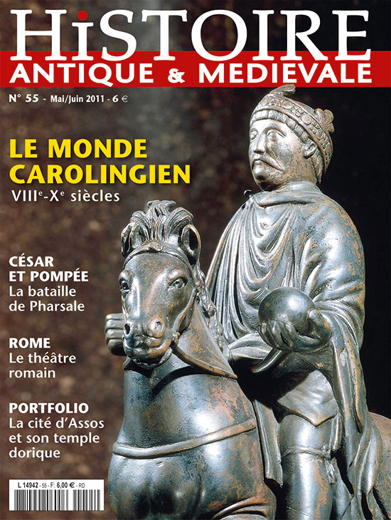 Au début du VIIIe siècle, le royaume des Francs (Regnum Francorum), héritage des conquêtes de Clovis, apparaît comme la seule position forte dans un occident divisé. Avec les conquêtes militaires de Charlemagne, le royaume s'agrandit, et les carolingiens mettent en place des cadres administratifs, et réforment l'Église séculière en restaurant les diocèses et l'autorité épiscopale. Le dossier de ce numéro décrit les jalons de la réorganisation du royaume sous les Carolingiens, leur rapport à la papauté, la réforme de l'épiscopat franc, et s'attache à décrire la vie à la cour franque pendant le règne de Charlemagne. Dans le magazine Histoire Antique N°55