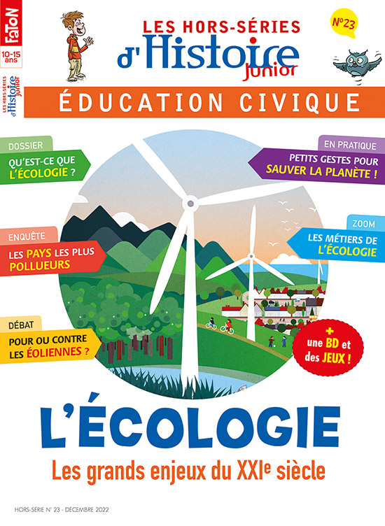 Dans ce hors-série Éducation civique « spécial écologie », réalisé par notre ami Nicolo, spécialiste de toutes les questions qui concernent la citoyenneté et la vie en société, tu pourras d’abord lire un dossier sur les grands enjeux écologiques du XXIe siècle. Tu découvriras ensuite une enquête sur les pays les plus pollueurs du monde, ainsi qu’un débat instructif sur un sujet très actuel : pour ou contre les éoliennes ? Tu te forgeras ainsi ton propre avis sur cette question ! Nicolo te présentera également une sélection de métiers liés à l’écologie, et il te donnera des pistes de lectures et de visites pour approfondir tes connaissances. Enfin, tu pourras relever cinq défis pour agir de manière écoresponsable ! Bonne lecture, et à très bientôt dans les prochains numéros d’Histoire Junior.