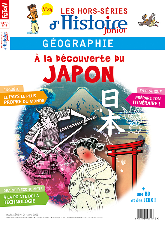 Ce hors-série « spécial Japon » te plonge directement dans la culture nippone avec l’étude d’une œuvre célèbre : La grande Vague de Kanagawa de Hokusai. Sais-tu que les tsunamis ne sont pas rares au Pays du Soleil-Levant ? Notre grand dossier t’en dit plus et aborde une foule de thématiques liées à la géographie ainsi qu’à l’histoire du Japon, qui n’aura plus aucun secret pour toi. Copernic et Gépéhesse te présenteront également les hautes technologies mises au point, depuis plus de 50 ans, par cette nation hypermoderne. Tu découvriras ensuite une enquête sur la propreté et la pollution. Qu’en est-il réellement derrière les rues nippones immaculées et les métros tokyoïtes resplendissants ? Enfin, nous te donnerons des idées de visites pour un voyage au Japon inoubliable ! Bonne lecture, et à très bientôt dans les prochains numéros d’Histoire Junior.