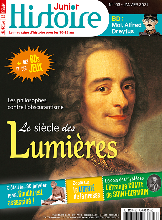 En janvier, Histoire Junior s'intéresse au siècle des Lumières. En Europe, au XVIIIe siècle, des philosophes et des scientifiques veulent combattre l'obscurantisme en diffusant largement le savoir et cherchent ainsi à sortir les peuples des ténèbres de l'ignorance où ils sont plongés depuis des siècles. Clio et Clovis te proposent ensuite un "zoom" sur la liberté de la presse, depuis ses origines jusqu'à aujourd'hui. Sans oublier tes actus, ton quiz, tes rubriques habituelles, ton cahier jeux et le douzième épisode de ta BD « Moi, Alfred Dreyfus ». Bonne lecture et très bonne année !