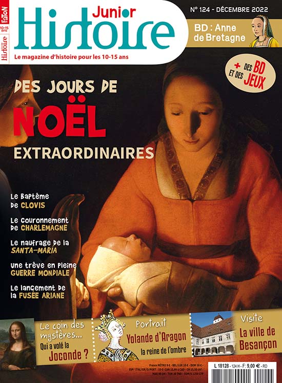 Ce mois-ci, Histoire Junior s’intéresse à quelques-uns des jours de Noël les plus mémorables de l'Histoire. Du tout premier, dont la date exacte n'est de toute évidence pas celle que l'on croit, aux plus récents, Clovis et Clio te proposent d'en découvrir quinze qui sont chacun à leur façon un précieux témoin de leur époque ! Puis nos deux amis te dressent le portrait de Yolande d'Aragon, la reine aux quatre royaumes, qui, au début du XVe siècle, a joué un rôle capital dans l'avènement de Charles VII au trône de France. Sans oublier tes rubriques habituelles, tes actus, ton quiz et ton cahier jeux. Bonne lecture !