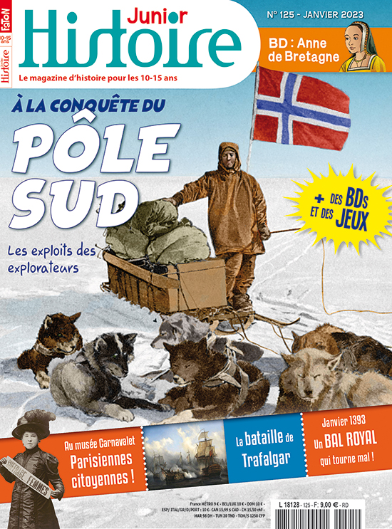 Ce mois-ci, Histoire Junior s’intéresse à l'une des dernières grandes explorations humaines menées sur Terre : le pôle Sud. Sais-tu que celui-ci n'a été officiellement atteint par l'Homme qu'en 1911 à la suite d'une expédition menée par le Norvégien Roald Amundsen ? Clovis et Clio reviennent justement sur cette incroyable histoire ! Puis nos deux amis te dressent le portrait de Pauline Bonaparte, la sœur préférée de l'empereur Napoléon Ier. Sans oublier tes rubriques habituelles, "C'était le..." ou encore "Correspondant de guerre", qui t'en diront plus sur le fameux bal des Ardents et la bataille de Trafalgar, ainsi que tes actus, ton quiz et ton cahier jeux. Bonne lecture !