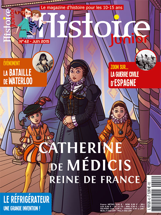 Ce mois-ci, Histoire Junior s'intéresse à Catherine de Médicis, une reine de France dont la réputation a longtemps été ternie par le massacre de la Saint-Barthélémy perpétré sous le règne de son fils Charles IX, dans la nuit du 23 au 24 août 1572... Clovis et Clio ont décidé d'aller au-delà de cet événement tragique des guerres de religion et de brosser le portrait d'une femme étonnante, mère d'une famille nombreuse, amoureuse des arts de la Renaissance et qui a été à la tête du royaume de France pendant près de 30 ans ! Un destin exceptionnel à découvrir... Prof'Hérodote et Histor décryptent ensuite pour toi la guerre civile espagnole qui, de 1936 à 1939, a opposé les Républicains aux Nationalistes dans un combat acharné et dévastateur. Découvre également dans ce numéro l'histoire de l'invention du réfrigérateur électrique qui a fait son apparition dans nos foyers après la Seconde Guerre mondiale, il y a un peu plus de 60 ans, mais aussi l'histoire d'un film culte réalisé par le célèbre acteur Charlie Chaplin (Charlot), sorti aux États-Unis en 1927 et intitulé "La ruée vers l'or". Enfin, mois de juin oblige, retour sur la célèbre bataille de Waterloo, survenue le 18 juin 1815, et qui a mis fin au règne de l'empereur Napoléon Ier. Très bonne lecture !