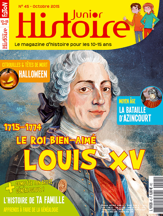 Ce mois-ci, Histoire Junior s'intéresse à Louis XV. L'arrière petit-fils du Roi-Soleil, monté sur le trône de France à l'âge de 5 ans. Surnommé au début de son règne le roi "bien-aimé", celui-ci perd finalement l'estime de son peuple et meurt en 1774 dans une indifférence quasi générale. Pourquoi ? Clovis et Clio reviennent sur l'histoire de ce roi méconnu, avant-dernier souverain à régner sur la France de l'Ancien Régime. Et si toi aussi tu avais un lien de parenté avec un monarque célèbre ? Quelle drôle d'idée penses-tu ? Et pourtant, tout est possible avec la généalogie ! Comment, tu ne sais pas ce que c'est ? Découvre-le vite en lisant le petit guide pratique pour connaître tes ancêtres. Tu pourras ensuite compléter toi-même l'arbre généalogique de ta propre famille… Cet été, Clovis et Clio ont assisté à un formidable spectacle de reconstitution historique dans la ville royale d'Amboise ; l'occasion pour eux de faire la connaissance d'une reconstitutionniste passionnée qui y a participé… Rencontre ! Sans oublier le discours célèbre du mois décortiqué par Prof'Hérodote, mais aussi l'histoire de la fête d'Halloween et un rappel des faits survenus le 25 octobre 1415 près du village d'Azincourt devenu depuis fort célèbre. Très bonne lecture !