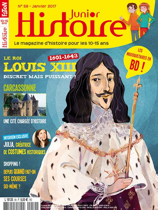 En janvier, Histoire Junior s'intéresse au roi de France Louis XIII. Même s'il paraît moins populaire que son père Henri IV et moins flamboyant que son fils Louis XIV, ce roi discret n'en est pas moins un souverain puissant dont le règne a profondément marqué l'histoire de France. Assisté de son ministre, le cardinal de Richelieu, il a parfaitement su tenir son rôle et préparer au mieux l'entrée du royaume dans le Grand Siècle. Dans ce dossier, Clovis et Clio te racontent la vie de ce roi juste. Puis direction le Sud-Ouest de la France et la ville de Carcassonne... Sais-tu qu'elle est la plus grande cité médiévale d'Europe ? Et c'est parti pour une visite guidée avec tes deux amis à travers son histoire et ses remparts magnifiquement préservés ! Que dirais-tu ensuite de découvrir l'exposition que le musée de l'Air et de l'Espace du Bourget présente actuellement ? Elle traite de la "première" guerre aérienne qui a fait rage dans le ciel de Verdun en 1916 ! C'est à ce moment-là en effet que l'avion a fait son entrée sur les champs de bataille. Prof'Hérodote a évidemment tenu à t'expliquer ce tournant décisif de l'histoire de la guerre moderne. Et si tu ne connais pas le métier de créateur de costumes historiques, Clovis et Clio sont allés pour toi à la rencontre de Julia Allègre, une créatrice de talent qui te présente cette activité tout à fait passionnante. Très bonne lecture et très bonne année 2017 !