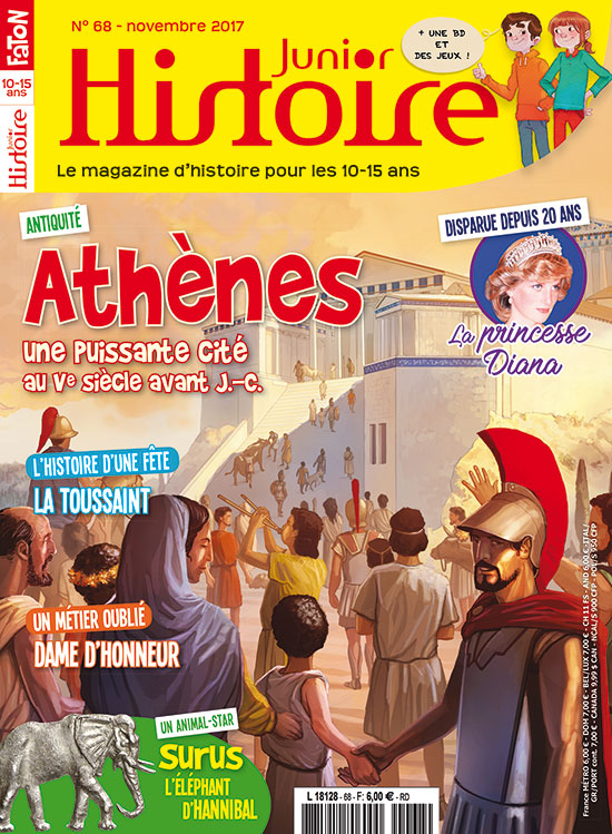 En novembre, Histoire Junior s'intéresse à la puissante cité d'Athènes au Ve siècle avant J.-C. Démocratie, arts, philosophie... on peut dire qu'elle a tout inventé ou presque ! Découvre vite son histoire passionnante, au moment même où elle se trouve au sommet de sa gloire. Clovis et Clio te réservent ensuite bien d'autres surprises : il y en aura pour tous les goûts et toutes les époques ! Nos deux amis te proposent notamment de faire connaissance avec Jacqueline Auriol, la première pilote d'essai française, et Lady Di, la princesse des cœurs, mais aussi de percer le secret des représentations du pouvoir à travers les âges et d'en savoir plus sur l'éléphant de guerre du célèbre général carthaginois Hannibal et la bataille de Bouvines, qui scella en 1214 le destin du royaume de France. Sans oublier tes jeux et un nouvel épisode de ta BD "L'Histoire sur un Plateau"... Très bonne lecture !