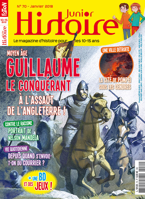 En janvier, Histoire Junior s'intéresse au célèbre Guillaume le Conquérant. Après avoir traversé La Manche, les armées du duc de Normandie se préparent enfin à affronter les troupes du roi Harold sur le sol anglais, près d'Hastings... Te voilà replongé(e) en 1066 au cœur d'un événement qui va faire date. Clovis et Clio te racontent tout ! Nos deux amis changent ensuite d'époque et de continent pour te présenter un défenseur obstiné des droits de l'Homme, qui devint en 1994 le premier président noir de l'Afrique du Sud : Nelson Mandela. Retour sur des années de lutte acharnée contre l'apartheid et ses lois injustes et racistes. Retrouve aussi tes rubriques préférées et découvre une "drôle de rumeur", une expo consacrée à la vie des soldats depuis l'Antiquité jusqu'à aujourd'hui, ainsi qu'une enquête passionnante sur l'éruption du Vésuve qui ensevelit la cité romaine de Pompéi en 79 après J.-C. Sans oublier tes jeux et un nouvel épisode de ta BD "L'Histoire sur un Plateau"... Bonne lecture et très bonne année 2018 !