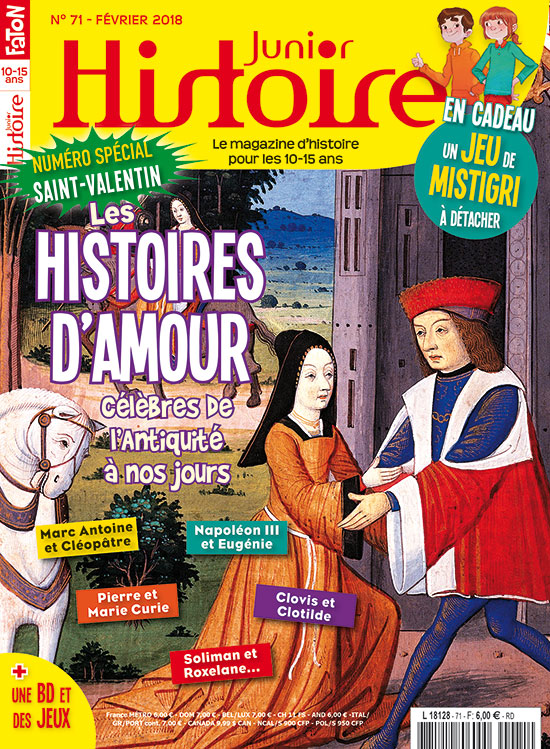 En février, Histoire Junior s'intéresse évidemment à l'événement le plus important du mois : la Saint-Valentin bien sûr ! Sais-tu d'ailleurs qu'elle est la fête des amoureux depuis le XVIe siècle ? Et ne crois pas que l'amour soit un "truc de filles" qui n'a rien à voir avec l'Histoire sérieuse... Non, l'amour a été aussi important que les guerres pour orienter le cours de l'Histoire. Pour l'élu/e de leur cœur, les hommes et femmes ont toujours été prêts à tout ! Au meilleur, comme au pire ! Pour te le prouver, Clovis et Clio ont sélectionné 10 histoires d'amour qui ont été vécues de l'Antiquité à nos jours. Il y aura des rois, des impératrices, des gangsters, des sultans, des espions, du sang, des mots doux, de l'action... sans oublier les jeux qui vont avec ! Bonne lecture !