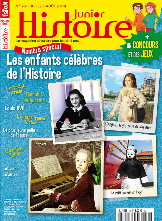 En juillet-août, Histoire Junior s'intéresse aux enfants célèbres de l'Histoire. Eh oui, ce n'est pas parce qu'on n'a pas encore 18 ans qu'on n'a pas le droit de marquer son époque ! Pour te le prouver, Clovis, Clio, Prof' Hérodote et Histor ont sélectionné douze jeunes qui se sont rendus célèbres dans le passé et dont on parle encore aujourd'hui. Parmi eux, des héritiers sans couronne, des petits derniers de grandes dynasties, des enfants hors-norme et des jeunes héros en lutte... Tu verras, leur destin est vraiment incroyable ! Très bonnes vacances et bonne lecture !