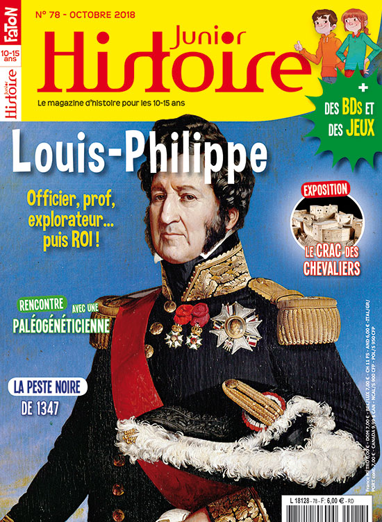 En octobre, Histoire Junior s'intéresse à Louis-Philippe Ier, le dernier roi à avoir régné en France. C'était au temps de la monarchie de Juillet, entre 1830 et 1848. Clovis et Clio te dressent le portrait de ce monarque méconnu, qui s'est fait appeler "roi-citoyen" ou encore "roi des Français", et qui a dû finalement abdiquer à la suite d'une nouvelle révolution ! Nos deux amis sont ensuite allés à la rencontre d'une paléogénéticienne, dont le métier consiste à explorer notre passé à travers l'étude de notre ADN. Sans oublier tes rubriques habituelles, une peinture célèbre décryptée, une anecdote étonnante sur la guerre de Cent ans, l'histoire d'une femme pionnière à l'origine du déchiffrement de l'alphabet maya ou encore une date à retenir... le 16 octobre 1793, le jour où Marie-Antoinette a été guillotinée ! Retrouve aussi tes jeux et un nouvel épisode de ta BD "L'Histoire sur un Plateau". Très bonne lecture !