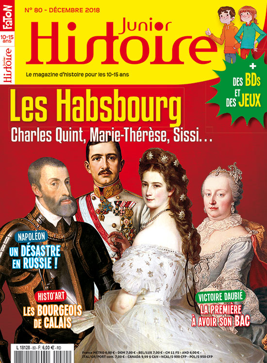 En décembre, Histoire Junior s'intéresse aux Habsbourg, l'une des plus célèbres dynasties d'Europe, qui s'est constituée un empire immense durant près de huit siècles, du Moyen Âge jusqu'à l'époque contemporaine. Son secret : les mariages plutôt que la guerre ! Clovis et Clio se sont ensuite intéressés à la première "bachelier" de France... Elle s'appelait Julie-Victoire Daubié et elle a bien été la première femme à obtenir le prestigieux diplôme, c'était en 1861. Puis, direction le glacial hiver russe pour revivre la terrible retraite de la Grande Armée en 1812 : une vraie catastrophe ! Sans oublier tes rubriques habituelles, une expo à la loupe, un carnet de visite, le portrait d'un roi célèbre et une drôle de rumeur, qui a eu un petit succès au XVIIe siècle et selon laquelle le masque de fer n'était autre que le frère jumeau du roi Louis XIV ! Retrouve aussi tes jeux et un nouvel épisode de ta BD "L'Histoire sur un Plateau". Très bonne lecture et bonnes fêtes de fin d'année !