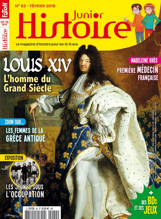 En février, Histoire Junior s'intéresse à l'homme du Grand Siècle, le Roi-Soleil, Louis XIV ! Il faut dire que le plus long règne de l'histoire de France méritait bien un dossier complet... Clovis et Clio te proposent donc d'en savoir plus sur ce roi vraiment hors du commun, premier monarque absolu, protecteur des arts et des sciences et conquérant averti, qui a profondément marqué la France de son empreinte majestueuse. Nos deux amis multiplient ensuite les bonds dans le temps pour te présenter la condition féminine dans l'Antiquité grecque et cette "génération 40" formée par les jeunes de 13-21 ans qui ont vécu pendant la Seconde Guerre mondiale. Un sacré programme... Sans oublier tes rubriques habituelles, une femme pionnière, une grande invention, un monument dans l'histoire et une drôle de rumeur consacrée ce mois-ci au plus célèbre des tueurs en série, Jack l'Éventreur ! Retrouve aussi tes jeux et un nouvel épisode de ta BD "L'Histoire sur un Plateau". Très bonne lecture !