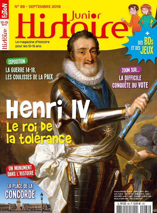 En septembre, Histoire Junior s'intéresse au roi Henri IV. Des guerres de Religion à son accession au trône et de l'édit de Nantes à son assassinat, Clovis et Clio parcourent avec toi plus d'un demi siècle d'histoire mouvementée qui a donné à la France moderne un grand roi de la tolérance. Puis nos deux amis retracent la longue conquête du vote dans notre pays, depuis la Révolution française jusqu'à nos jours où tous les citoyens et les citoyennes de plus de 18 ans peuvent enfin s'exprimer par les urnes ! Retrouve aussi tes rubriques habituelles et tes jeux, sans oublier un nouvel épisode de ta BD "L'histoire sur un plateau". Très bonne lecture !