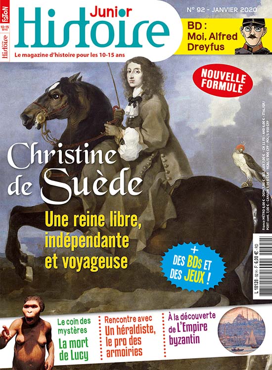 En janvier, Histoire Junior s'intéresse à Christine de Suède, une reine libre et rebelle du XVIIe siècle. Couronnée à l'âge de 6 ans, celle-ci renonce finalement au trône en 1654 pour lui préférer une vie de voyages qui vont la mener dans les plus grandes villes d'Europe... Clovis et Clio reviennent sur ce destin étonnant et méconnu. Puis nos deux amis font un détour par l'Empire byzantin pour te raconter son histoire prestigieuse, depuis ses origines romaines au IVe siècle jusqu'à la conquête de Constantinople, sa capitale, par les Turcs en 1453. Sans oublier tes actus, ton quiz et ton cahier jeux, le deuxième épisode de ta nouvelle BD « Moi, Alfred Dreyfus » et un « coin des mystères » consacré cette fois-ci aux causes présumées de la mort de Lucy... Bonne lecture !
