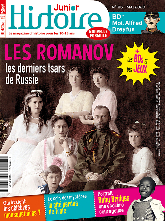 En mai, Histoire Junior s'intéresse au destin tragique des Romanov. Dans la Russie impériale du début du XXe siècle, tout semble sourire au tsar Nicolas II : un pouvoir sans partage et un empire fort, une épouse aimante et cinq beaux enfants. Voilà pourtant que la révolte gronde hors des palais, et que le peuple n'en peut plus. En 1917, c'est la révolution et soudain tout bascule pour les Romanov qui perdent tout, y compris la vie ! Clovis et Clio reviennent pour toi sur ces années de fin de règne. Nos deux amis te dressent ensuite le portrait de Ruby Bridges, une jeune écolière noire américaine qui, en 1960, a fait preuve d'un grand courage pour braver seule les derniers interdits de la ségrégation. Sans oublier tes actus, ton quiz, ton cahier jeux et le cinquième épisode de ta nouvelle BD « Moi, Alfred Dreyfus ». Bonne lecture !