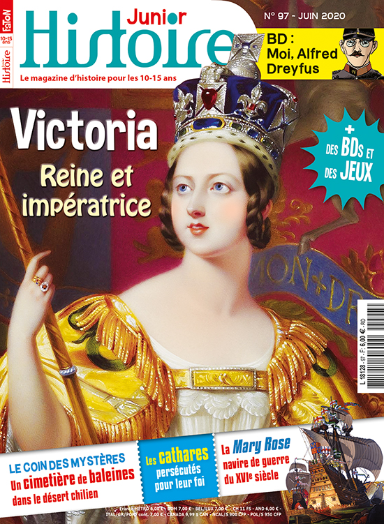 En juin, Histoire Junior s'intéresse à Victoria, reine d'Angleterre, d'Irlande, d'Australie, du Canada, et impératrice des Indes, morte en 1901. Son règne, exceptionnellement long de plus de 63 ans, a permis de faire du royaume britannique un empire sur lequel « le soleil ne se couche jamais » ! Clovis et Clio reviennent pour toi sur le destin hors du commun de cette souveraine de caractère. Nos deux amis partent ensuite à la rencontre des cathares, des chrétiens hérétiques du XIIIe siècle contre lesquels une croisade sanglante a été lancée par le pape et le roi de France. Sans oublier tes actus, ton quiz, ton cahier jeux et le cinquième épisode de ta nouvelle BD « Moi, Alfred Dreyfus ». Bonne lecture !