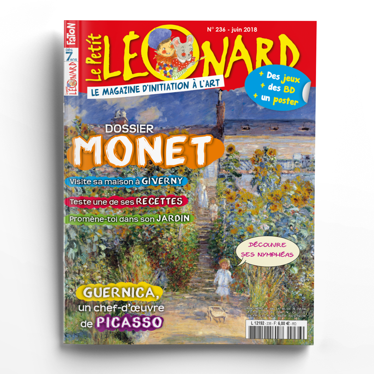 Ce mois-ci, nous avions envie de te parler de l’artiste Claude Monet et de toutes ses passions : la peinture bien sûr, et aussi le jardinage, la cuisine, l’art du Japon… Tu vas découvrir ses chefs-d’œuvre, visiter sa maison et son jardin de Giverny, et même goûter une mousse aux fraises trouvée dans ses carnets ! Nous te raconterons ensuite l’histoire de Guernica, célèbre tableau d’un autre grand artiste, Picasso, ainsi que la vie bien remplie de Léonard Foujita.