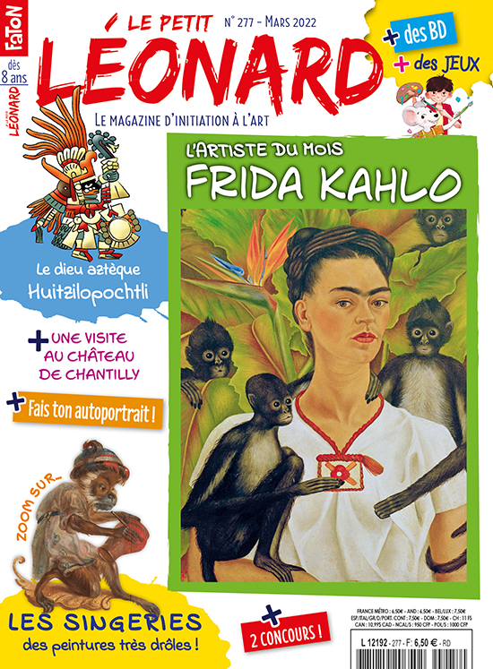 Ce mois-ci, envolons-nous vers le Mexique pour rencontrer une grande artiste : Frida Kahlo. Connaissez-vous ses autoportraits ? Ils ont fait le tour du monde ! Nous vous montrerons ce qu’elle a peint d’autre et vous ferons mieux comprendre son univers. Ensuite, nous vous parlerons des singeries, ces tableaux et décors dans lesquels les singes ont pris la place des hommes. Un nouvel épisode du Manoir Aquarelle, la suite de Rosa Bonheur, la dernière salle du musée des animaux, un Récré’Art pour apprendre à faire son autoportrait : ouvrez vite ce nouveau numéro !