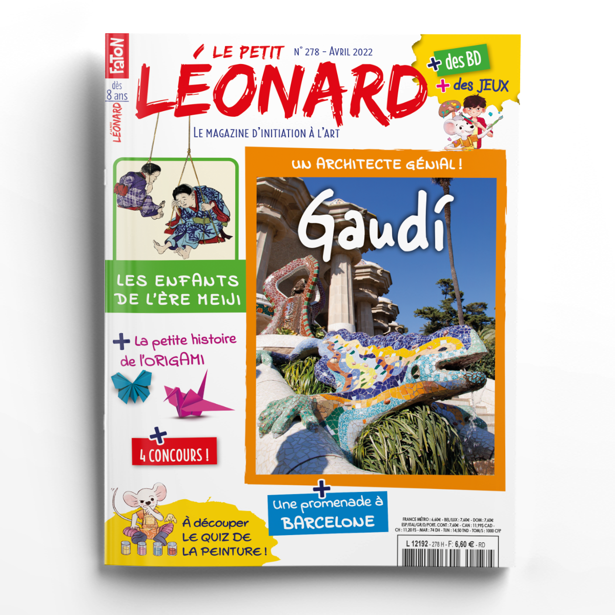 Bonjour chers amis ! Si nous voyagions ce mois-ci ? Direction Barcelone d’abord, où l’architecte Antoni Gaudí a construit des bâtiments spectaculaires, plein de couleurs et de formes inspirées de la nature. L’occasion de tester dans notre Récré’Art une technique qu’il adorait : le trencadis. Ensuite, direction le Japon pour un plongeon dans l’ère Meiji. À cette époque, le Japon découvrait et adoptait les coutumes d’autres pays. Tu vas voir cela à hauteur d’enfant ! Nous t’avons aussi préparé un jeu de cartes à découper : le grand quiz de la peinture. Avec en prime des concours et des BD, tu as de quoi t’amuser ! Bonne lecture !