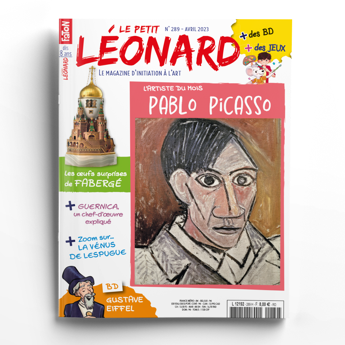 Bonjour chers amis ! Ce mois-ci, nous allons vous parler d’un artiste célèbre dans le monde entier : Pablo Picasso. Savez-vous pourquoi il est si important dans l’histoire de l’art du 20e siècle ? Nous allons vous l’expliquer et vous faire observer à la loupe son chef-d’œuvre, Guernica. Vous pourrez même vous amuser à réaliser une empreinte à sa manière ! Pour célébrer Pâques, nous pousserons la porte de l’atelier d’un autre génie, l’orfèvre Fabergé, afin de découvrir ce qui se cache dans ses précieux œufs surprises... Amusez-vous aussi avec les BD, les jeux et les concours ! Bonne lecture !