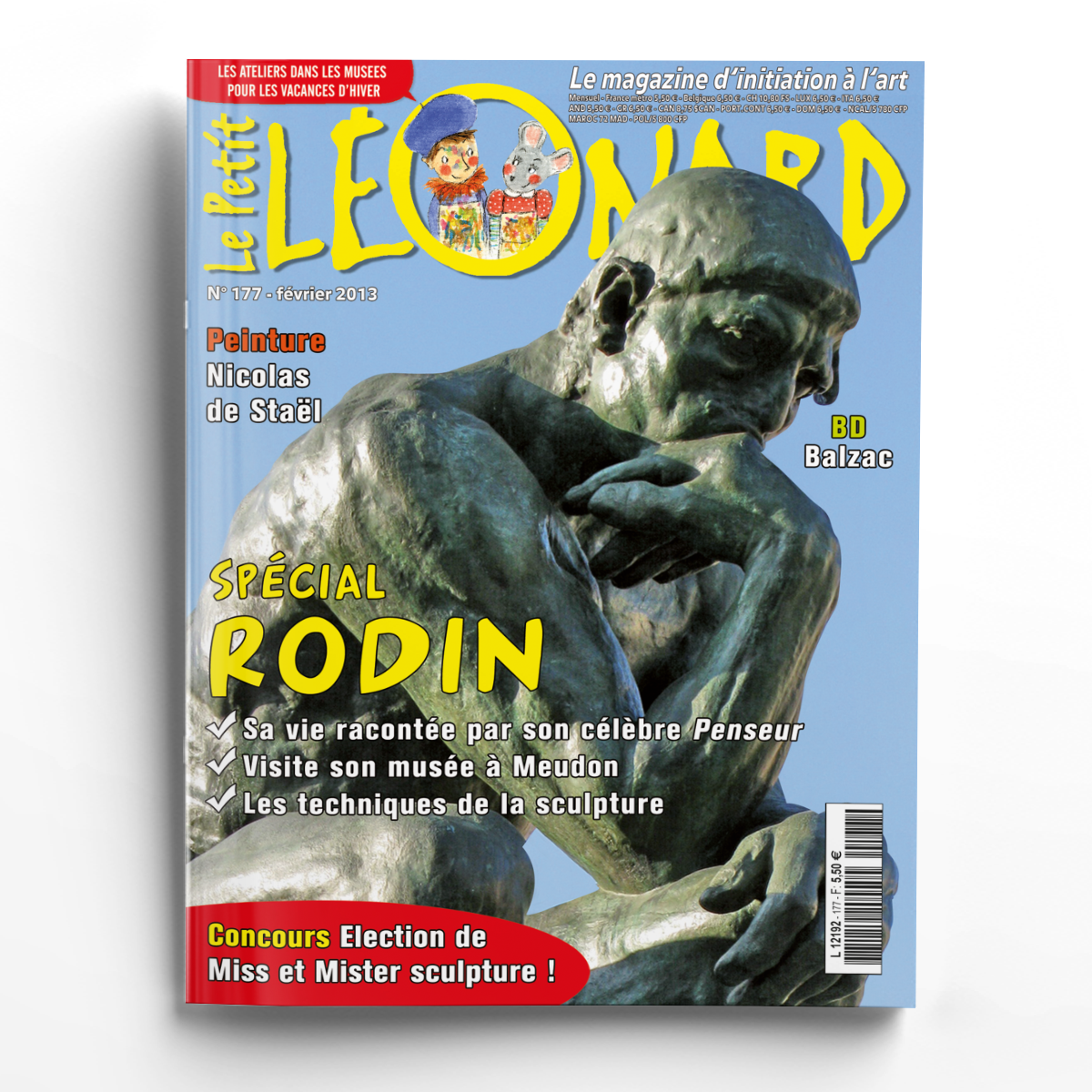 Ce mois-ci Léonard et Joconde te proposent un numéro spécial Rodin ! Tu vas découvrir la vie de ce grand sculpteur racontée par son célèbre Penseur, visiter son musée à Meudon et apprendre les différentes techniques de la sculpture. Participe à notre grand concours : élection de Miss et Mister sculpture de tous les temps ! A lire également l'article sur Nicolas de Staël, les ateliers dans les musées pour les vacances de février, la bd sur Balzac et la rubrique " A lire" !